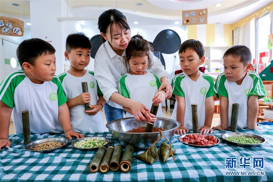 6月23日,長興縣李家巷鎮(zhèn)中心幼兒園的孩子們在老師的帶領(lǐng)下,一起學(xué)習(xí)制作端午粽子和竹筒飯。為了迎接即將到來的端午節(jié),浙江省湖州市長興縣各個幼兒園開展“品民俗迎端午”主題活動,讓小朋友們體驗傳統(tǒng)民俗文化。新華社記者徐昱攝