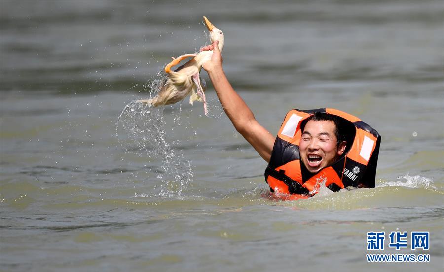 6月25日,參賽選手將放歸漢江中的鴨子抓到手中,鉆出水面,舉過(guò)頭頂,引來(lái)岸上一片歡呼。龍舟賽最引人注目的是搶鴨子、抓鯉魚。新華社記者 陶明 攝