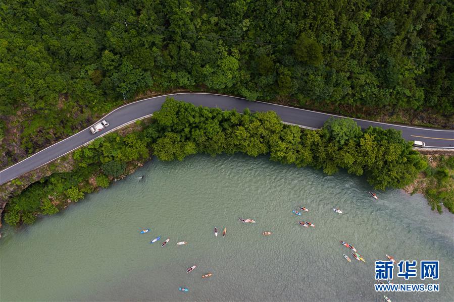 水上運(yùn)動(dòng)愛好者在杭州市富陽(yáng)區(qū)湖源鄉(xiāng)的壺源溪上體驗(yàn)槳板運(yùn)動(dòng)的樂趣(6月28日攝,無人機(jī)照片)。近期,浙江省杭州市富陽(yáng)區(qū)場(chǎng)口鎮(zhèn)、常安鎮(zhèn)和湖源鄉(xiāng)組團(tuán)開啟了一場(chǎng)夏季“綠水青山嘉年華”。這幾個(gè)壺源溪流域鄉(xiāng)鎮(zhèn)整合生態(tài)旅游資源,組團(tuán)開發(fā)山村旅游項(xiàng)目,游客可以參與壺源溪水上游樂、露營(yíng)永安山頂、特色農(nóng)產(chǎn)品集市和瓜果節(jié)等特色活動(dòng)。新華社記者徐昱攝