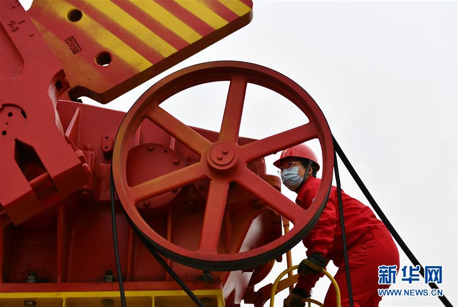 6月29日,馮萌萌在大港油田采油二廠二區(qū)內(nèi)檢查機(jī)器皮帶磨損情況。新華社記者李然攝
