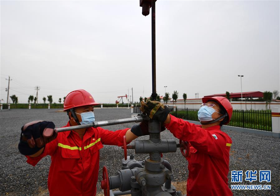 6月29日,馮萌萌(右)和同事在大港油田采油二廠二區(qū)內(nèi)查看設(shè)備運行情況。新華社記者李然攝