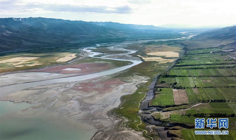 這是6月29日無人機拍攝的位于新疆特克斯縣境內(nèi)的喀拉托海湖風光(無人機照片)。時值夏日,位于天山腳下的新疆特克斯縣境內(nèi)的喀拉托海湖風光宜人,景色優(yōu)美。新華社記者王菲攝