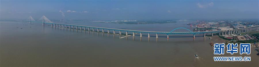 滬蘇通長江公鐵大橋(6月30日攝,無人機(jī)全景拼接照片)。即將于7月1日通車的滬蘇通長江公鐵大橋北起江蘇南通,南至江蘇張家港,公鐵合建跨江正橋全長5827米,為集合高速公路、客貨混線鐵路、高速鐵路的“三合一”過江通道,建成通車后將有效促進(jìn)長三角城市群跨江融合、協(xié)同發(fā)展。新華社記者李博攝