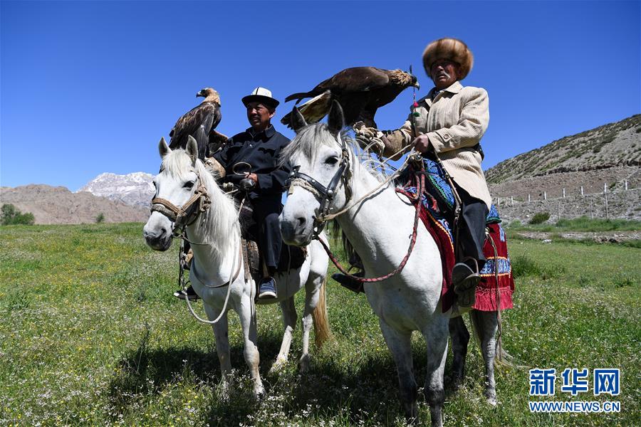 6月29日,庫(kù)爾馬西·胡特曼(右)和他的徒弟們展示獵鷹。新華社記者宋彥樺攝