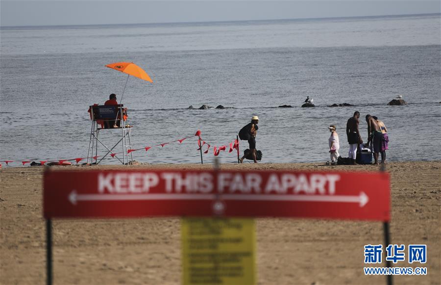 7月1日,救生員在美國(guó)紐約科尼島的一處海灘查看海面情況。當(dāng)日,美國(guó)紐約市屬八處海灘正式重新準(zhǔn)許民眾游泳,救生員也同時(shí)上崗。新華社記者王迎攝