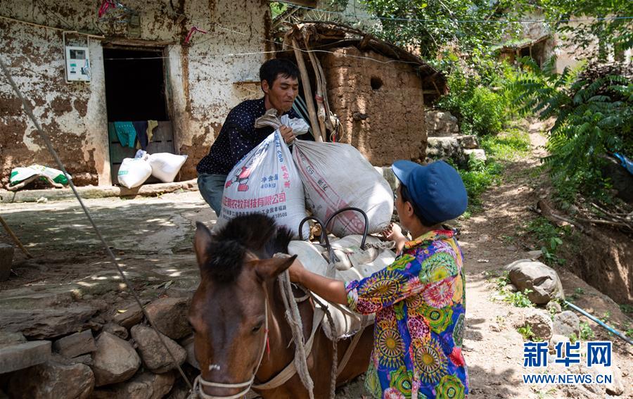 且沙次干把兩袋谷物放在馬背上(6月27日攝)。當(dāng)日,且沙次干和妻子阿達么日雜把老房子里的糧食、家什等收拾一番,準(zhǔn)備搬進村集中安置點的新居。新華社記者 江宏景 攝