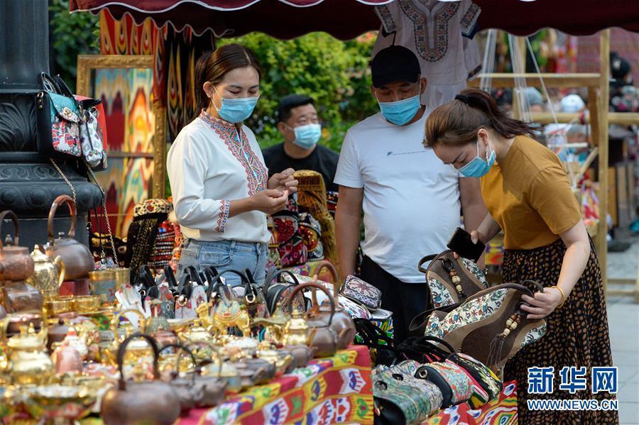 游客在烏魯木齊大巴扎景區(qū)選購商品(7月4日攝)。夏日周末,烏魯木齊市大巴扎景區(qū)內(nèi)熙熙攘攘,人們來到這里品嘗美食、休閑購物。2018年,經(jīng)過靚化改造后的大巴扎景區(qū)新增長約800米的步行街,分為文創(chuàng)文旅和“非遺”項目街區(qū)、國際時尚街區(qū)和大巴扎美食街區(qū),是烏魯木齊最受歡迎的旅游目的地之一。新華社記者丁磊攝