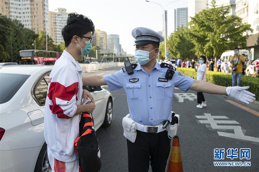 7月7日,在位于北京的中國(guó)人民大學(xué)附屬中學(xué)考點(diǎn)外,北京市公安局公安交通管理局海淀交通支隊(duì)中關(guān)村大隊(duì)交警殷宏偉(右)指揮前來(lái)送考生的車(chē)輛有序停好,引導(dǎo)考生迅速前往考點(diǎn)。當(dāng)日,2020年高考拉開(kāi)帷幕。新華社記者沈伯韓攝