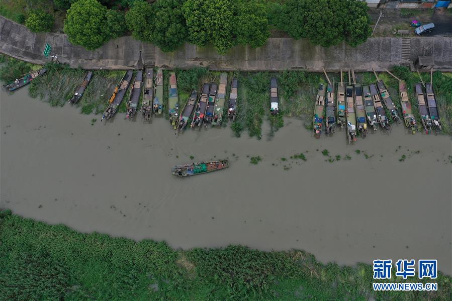 在吳興高新區(qū)幻溇村的避風(fēng)港,停泊了大批漁船(7月7日攝,無人機照片)。近日,位于浙江北部的湖州市遭遇多輪降雨,東部平原河網(wǎng)普遍超警戒水位,水庫山塘高位運行。7月5日12時30分,湖州市人民政府防汛防旱指揮部將防汛應(yīng)急響應(yīng)提升至Ⅲ級,要求各地密切監(jiān)測汛情,切實做好各項防范工作,確保安全度汛。新華社記者黃宗治攝