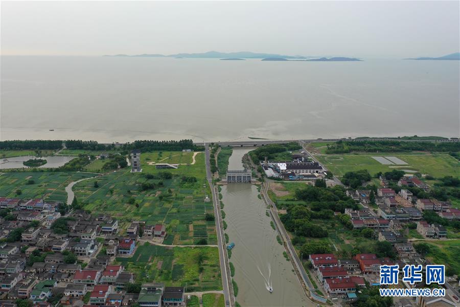 7月7日無人機(jī)拍攝的吳興高新區(qū)幻溇村連通太湖的水閘。太湖水位近期持續(xù)上漲。近日,位于浙江北部的湖州市遭遇多輪降雨,東部平原河網(wǎng)普遍超警戒水位,水庫山塘高位運行。7月5日12時30分,湖州市人民政府防汛防旱指揮部將防汛應(yīng)急響應(yīng)提升至Ⅲ級,要求各地密切監(jiān)測汛情,切實做好各項防范工作,確保安全度汛。新華社記者黃宗治攝