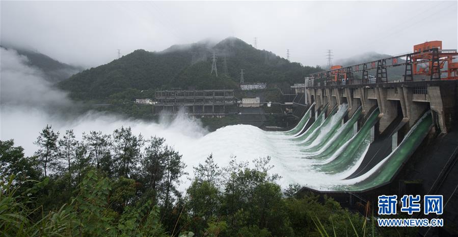 7月7日下午開啟7孔泄洪的新安江水庫(手機全景模式拍攝)。受持續(xù)降水影響,浙江新安江水庫水位持續(xù)快速上升。繼當日10時開啟3孔、12時開啟5孔泄洪后,新安江水庫于16時增加到7孔泄洪。新安江水庫是華東地區(qū)最大的水庫,在錢塘江流域的防洪度汛中起到關(guān)鍵作用。新華社記者翁忻旸攝