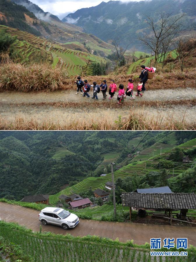 這是一張拼版照片,上圖:在廣西龍勝龍脊鎮(zhèn)江柳村,余啟貴老師背著背簍領(lǐng)著學(xué)生去學(xué)校(2013年2月26日攝);下圖:在廣西龍勝龍脊鎮(zhèn)江柳村,余啟貴老師開著自己的汽車帶著學(xué)生去學(xué)校(7月7日攝)。新華社記者陸波岸攝