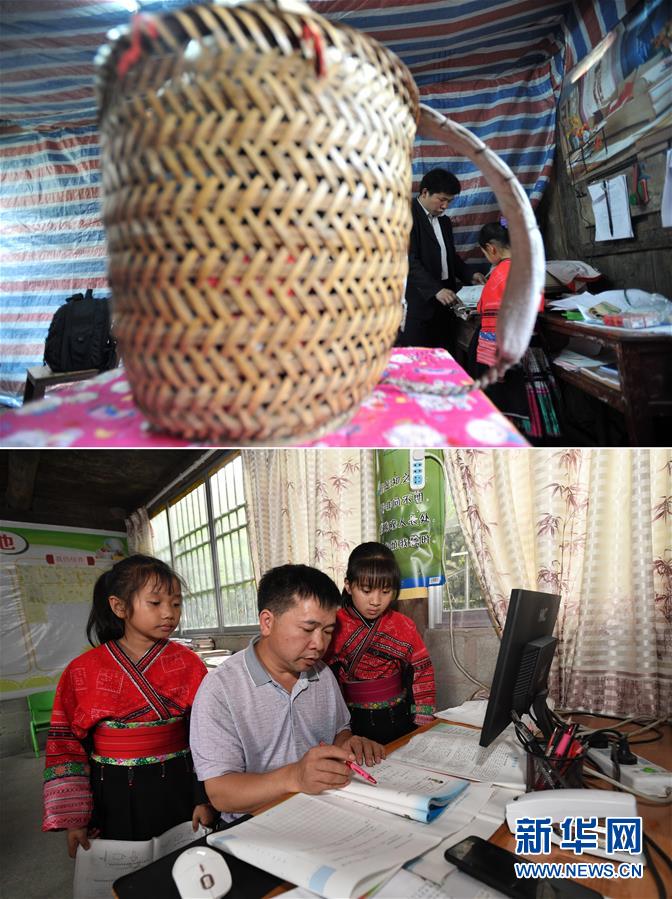 這是一張拼版照片,上圖:在廣西龍勝龍脊鎮(zhèn)江柳村翁江小學(xué),余啟貴老師輔導(dǎo)學(xué)生做課堂作業(yè)(2013年2月26日攝);下圖:在廣西龍勝龍脊鎮(zhèn)江柳村翁江小學(xué),余啟貴老師輔導(dǎo)學(xué)生做課堂作業(yè)(7月7日攝)。新華社記者陸波岸攝