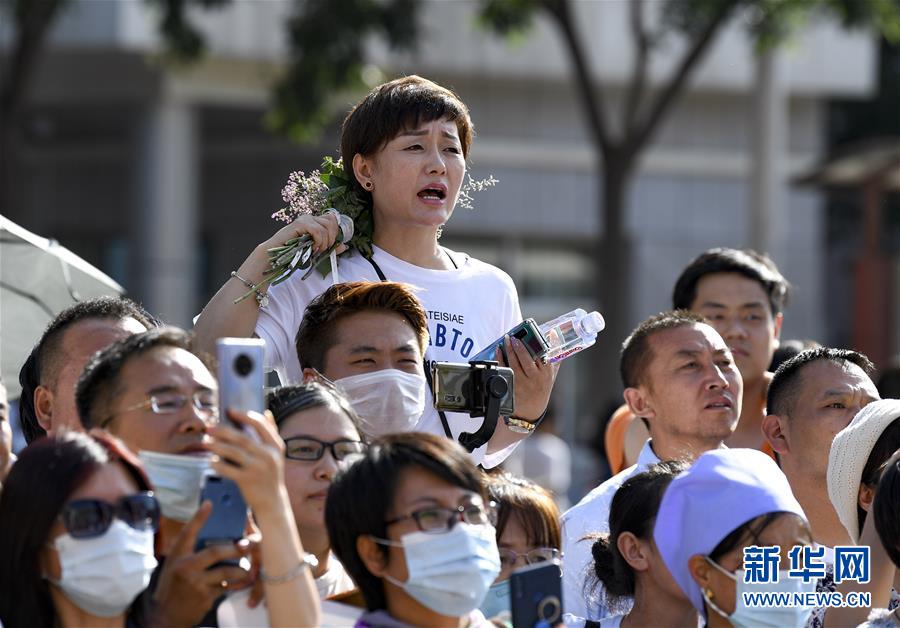 7月8日,考生拿著鮮花向湖南省長(zhǎng)沙市一中考點(diǎn)外等候的家長(zhǎng)示意。當(dāng)日,全國(guó)部分地區(qū)2020年高考結(jié)束。新華社記者薛宇舸攝