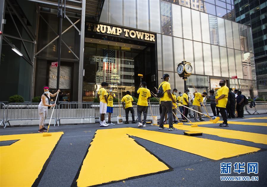 7月9日,在美國紐約第五大道特朗普大廈前,人們涂寫“黑人的命也是命”標(biāo)語。當(dāng)天,數(shù)十人在紐約第五大道特朗普大廈前的路面上涂寫“黑人的命也是命”標(biāo)語。紐約市計劃在多處地點涂寫“黑人的命也是命”標(biāo)語。新華社記者王迎攝