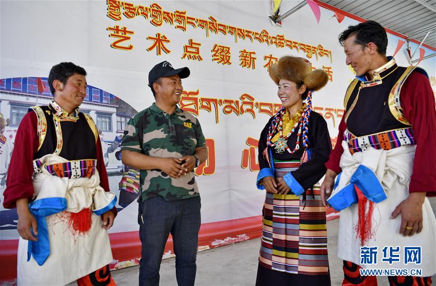 山南市扎囊縣桑耶鎮(zhèn)乃卡村第一書(shū)記、駐村工作隊(duì)隊(duì)長(zhǎng)次仁羅布(左二)和村文藝演出隊(duì)演員交流(7月7日攝)。新華社記者張汝鋒攝