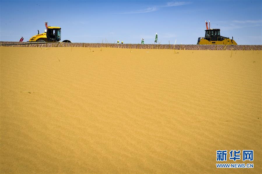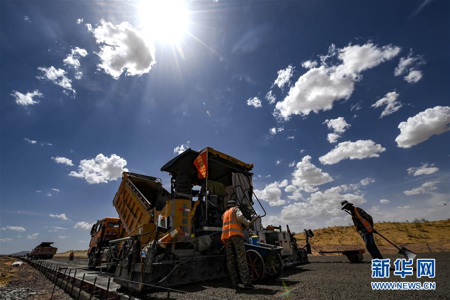 7月10日,工人在位于寧夏境內(nèi)的烏瑪高速青銅峽至中衛(wèi)段A10標(biāo)段施工。盛夏時(shí)節(jié),位于寧夏境內(nèi)的烏瑪(內(nèi)蒙古烏海市至青?,斍呖h)高速青銅峽至中衛(wèi)段正在抓緊施工建設(shè)。該路段主線全長(zhǎng)122.9公里,其中穿越騰格里沙漠腹地的18公里公路是寧夏建設(shè)的首條沙漠高速公路,預(yù)計(jì)2021年建成通車(chē)。新華社記者馮開(kāi)華攝。