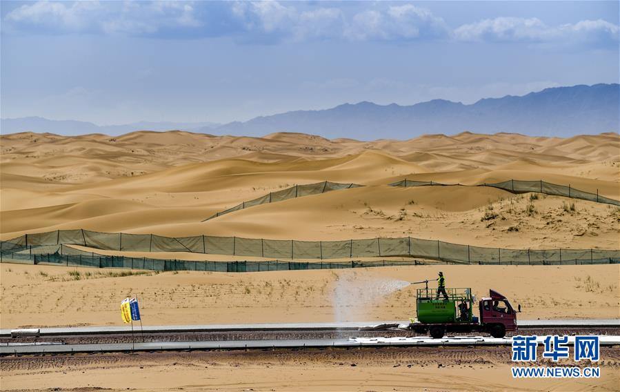 7月10日,工人在位于寧夏境內(nèi)的烏瑪高速青銅峽至中衛(wèi)段A9標(biāo)段施工。盛夏時(shí)節(jié),位于寧夏境內(nèi)的烏瑪(內(nèi)蒙古烏海市至青海瑪沁縣)高速青銅峽至中衛(wèi)段正在抓緊施工建設(shè)。該路段主線全長(zhǎng)122.9公里,其中穿越騰格里沙漠腹地的18公里公路是寧夏建設(shè)的首條沙漠高速公路,預(yù)計(jì)2021年建成通車(chē)。新華社記者馮開(kāi)華攝。