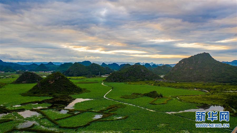這是7月8日拍攝的普者黑國家濕地公園的夕陽景觀(無人機照片)。