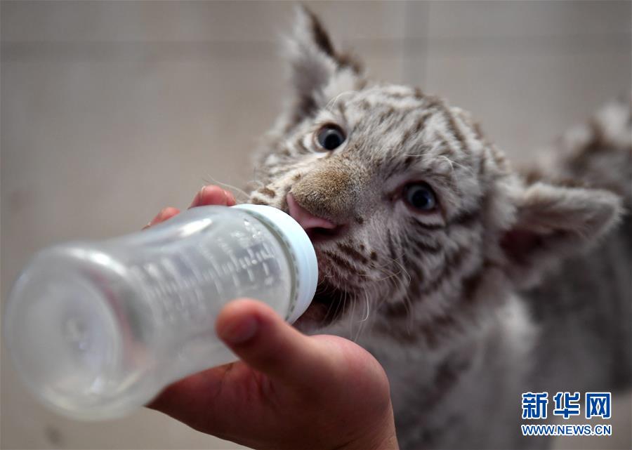 7月13日,工作人員給“妞妞”喂水。河北石家莊市動物園的孟加拉白虎寶寶“妞妞”只有3個月大,由于虎媽媽經(jīng)驗不足,“妞妞”一出生便由動物園工作人員按科學方法人工飼養(yǎng)。目前,在飼養(yǎng)員的精心照料下,“妞妞”正在茁壯成長。新華社記者 王曉 攝