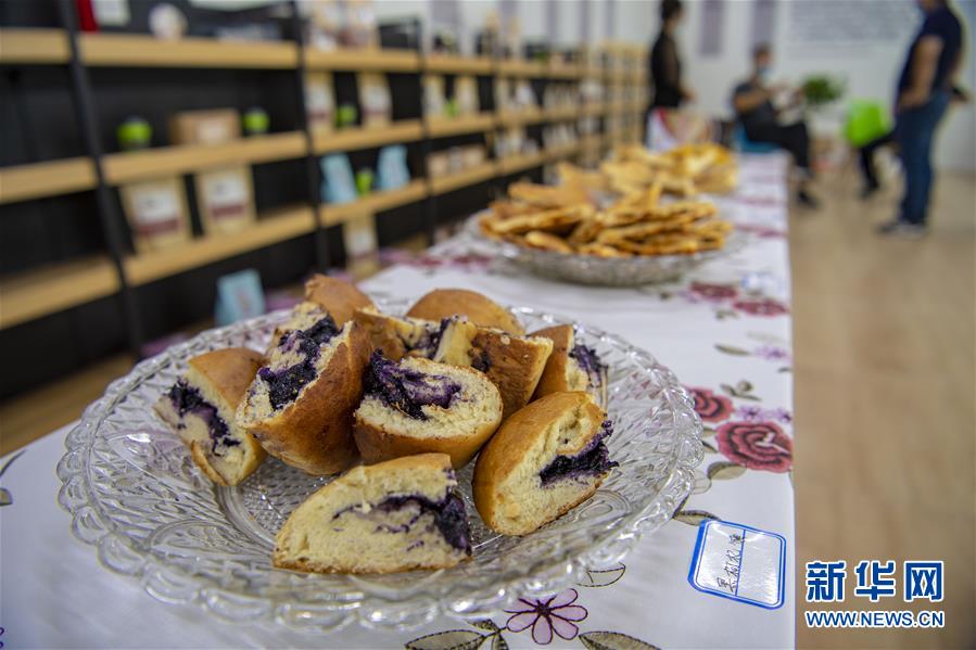 7月13日在新疆精河縣精河鎮(zhèn)馕文化產(chǎn)業(yè)示范基地拍攝的供顧客品嘗的“黑枸杞馕”。近日,新疆精河縣10萬余畝枸杞陸續(xù)成熟,當?shù)剞r(nóng)民搶抓農(nóng)時,采收枸杞。近年來,精河縣持續(xù)發(fā)展和培育枸杞“紅色產(chǎn)業(yè)鏈”,加大資金扶持力度,提升精河枸杞的品牌效應(yīng),帶動農(nóng)民增收致富。精河縣位于新疆天山山脈北麓,準噶爾盆地西南邊緣。當?shù)厝照諘r間長、晝夜溫差大且氣候干燥,有利于枸杞果實糖分和藥用成分積累。新華社記者 胡虎虎 攝