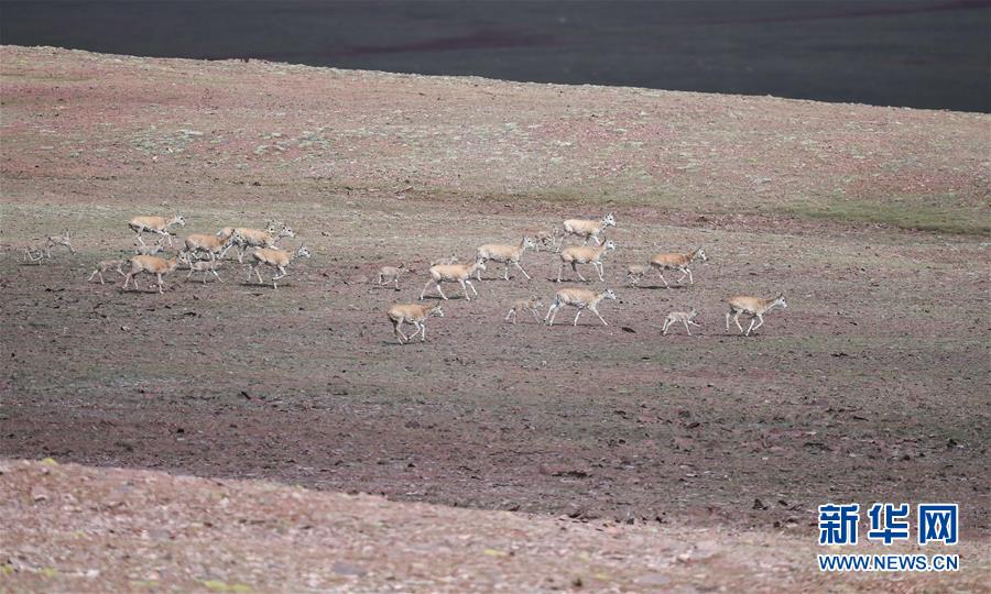 7月7日在可可西里卓乃湖區(qū)域拍攝的一群藏羚羊。目前正值藏羚羊產(chǎn)仔季。來(lái)自青海三江源、新疆阿爾金山、西藏羌塘等地的藏羚羊來(lái)到位于青海省可可西里腹地、被譽(yù)為“藏羚羊大產(chǎn)房”的卓乃湖區(qū)域產(chǎn)仔。新華社記者 張龍 攝