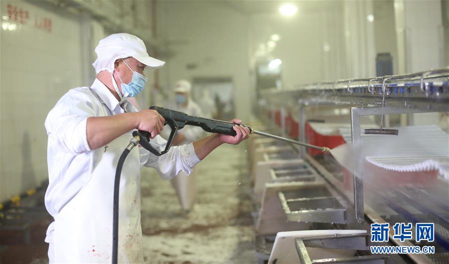 7月14日,北京二商肉類食品集團(tuán)有限公司員工對(duì)肉類分割流水線進(jìn)行清洗消毒。北京二商肉類食品集團(tuán)有限公司是保障北京肉類市場供應(yīng)的主要企業(yè)之一。新冠肺炎疫情以來,企業(yè)嚴(yán)格實(shí)施北京市、農(nóng)業(yè)農(nóng)村部和中國肉類協(xié)會(huì)的防疫要求,對(duì)進(jìn)入廠區(qū)的人員、車輛以及原料采購、屠宰分割、產(chǎn)品加工、貯藏運(yùn)輸、廢棄物收集及污水處理等生產(chǎn)環(huán)節(jié)嚴(yán)格防疫,強(qiáng)調(diào)源頭把關(guān)徹底消毒。目前,集團(tuán)公司下屬多家生豬屠宰加工基地正常運(yùn)營,保質(zhì)保量供應(yīng)北京市場需求。新華社記者 李欣 攝