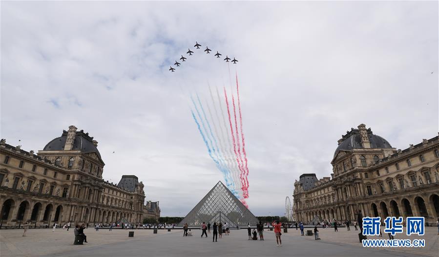 7月14日,“法蘭西巡邏兵”飛行表演隊(duì)飛過法國巴黎盧浮宮玻璃金字塔廣場。法國一年一度的國慶閱兵式14日在巴黎舉行。受疫情影響,法國總統(tǒng)馬克龍沒有在香榭麗舍大街舉行國慶閱兵式,而是在協(xié)和廣場舉行小型慶祝儀式,向在抗疫斗爭中做出貢獻(xiàn)的公民致敬。新華社記者高靜攝