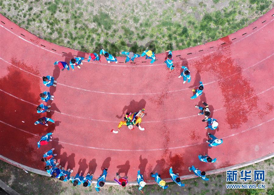“久河卓舞”傳承人尼瑪在瓊結(jié)縣下水鄉(xiāng)小學(xué)進行教學(xué)表演(7月2日攝,無人機照片)。新華社記者詹彥攝