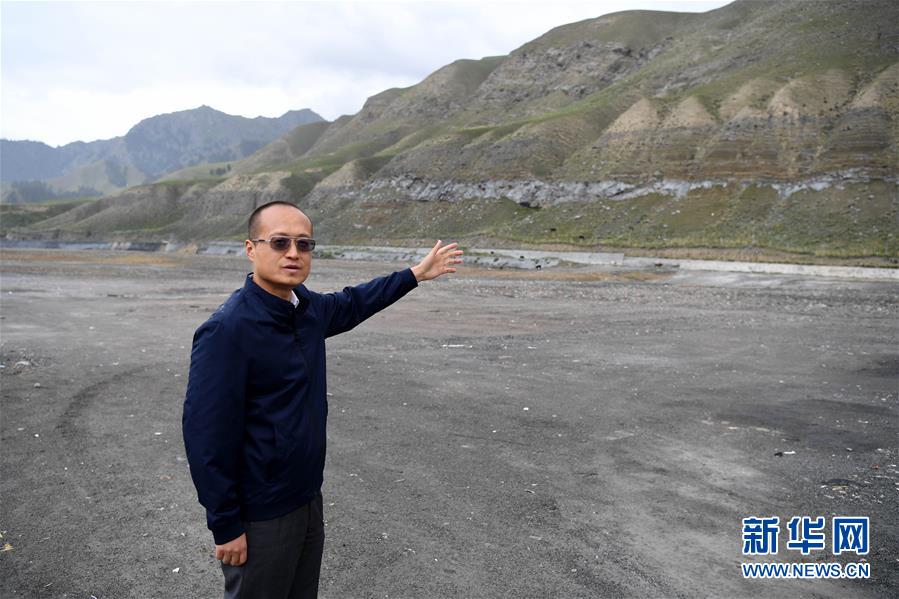 7月16日,烏魯木齊市生態(tài)環(huán)境局烏魯木齊縣分局局長嚴(yán)偉濤介紹一家企業(yè)的礦坑被回填的情況。新華社記者沙達(dá)提攝