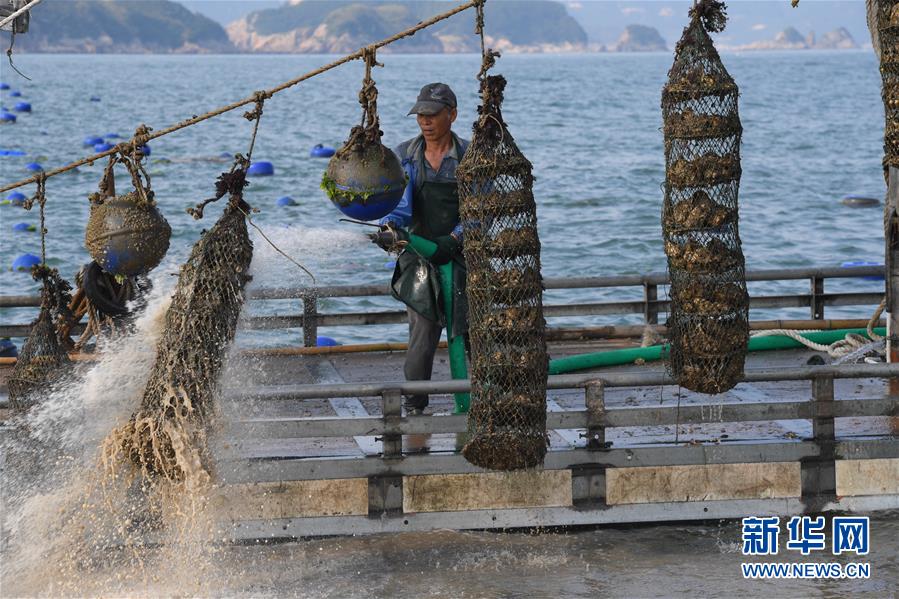 7月16日,在福建省霞浦縣長(zhǎng)春鎮(zhèn)海域,收獲生蠔的漁民在沖洗蠔籠。新華社記者姜克紅攝