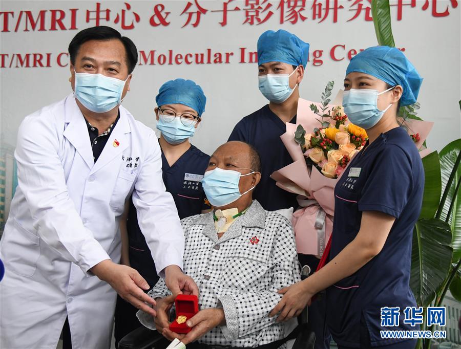 7月21日,武漢大學(xué)人民醫(yī)院醫(yī)護(hù)人員護(hù)送崔先生出院。新華社記者程敏攝