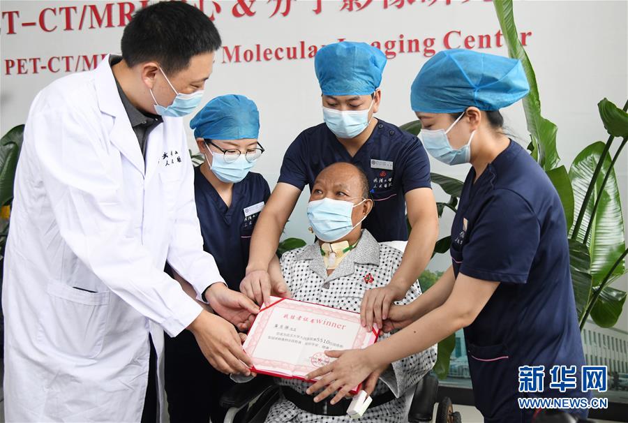 7月21日,國家衛(wèi)健委醫(yī)政醫(yī)管局醫(yī)療質(zhì)量與評價處副處長馬旭東(左一)為崔先生頒發(fā)了編號為“5510”的“戰(zhàn)勝者證書”。新華社記者程敏攝