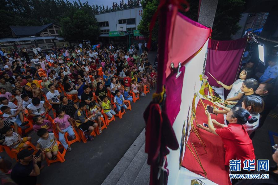 當(dāng)日,浙江省杭州市余杭區(qū)塘棲鎮(zhèn)河西埭村“衛(wèi)家班皮影戲”劇團(tuán)的藝人們來(lái)到余杭區(qū)喬司街道和睦橋村進(jìn)行演出,這是近期杭州市余杭區(qū)夏季鄉(xiāng)村“文化走親”的重要活動(dòng)之一。今年6月開(kāi)始,杭州市余杭區(qū)塘棲鎮(zhèn)組織多支文化表演團(tuán)體以“文化走親”的形式,先后送戲到余杭區(qū)近20個(gè)鄉(xiāng)村文化禮堂,豐富夏日鄉(xiāng)村百姓文化生活。在余杭塘棲一帶,歷史上曾活躍著一支以演出皮影戲出名的民間戲班子,號(hào)稱“衛(wèi)家班”。2016年,塘棲鎮(zhèn)河西埭村在文化禮堂的建設(shè)過(guò)程中,將當(dāng)?shù)貍鹘y(tǒng)的“衛(wèi)家班皮影戲”作為“一村一品”特色項(xiàng)目進(jìn)行了搶救性保護(hù)。2018年12月,“衛(wèi)家班皮影戲”被列入杭州市非物質(zhì)文化遺產(chǎn)代表性項(xiàng)目名錄。新華社記者徐昱攝