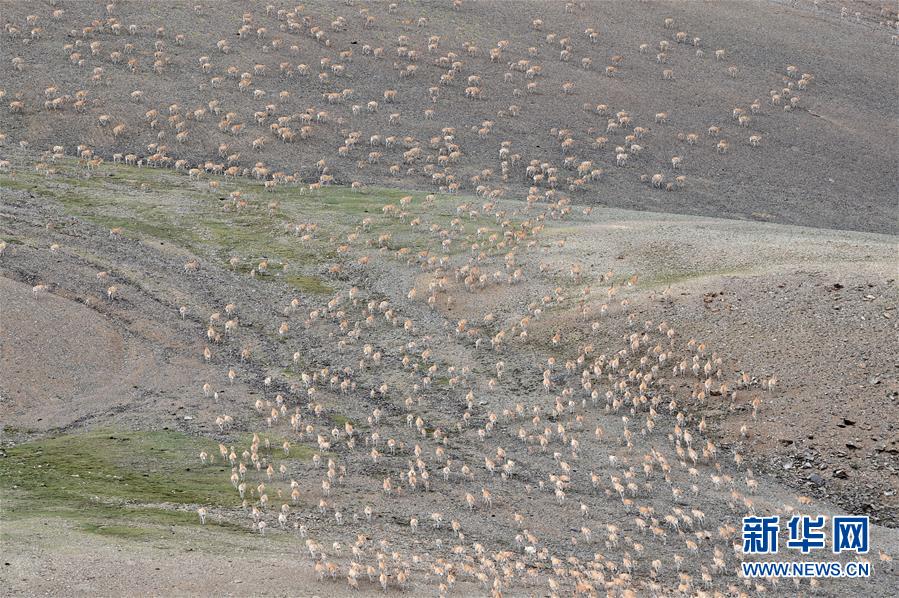 7月17日,藏羚羊群在西藏尼瑪縣榮瑪鄉(xiāng)附近悠閑吃草。2000年,西藏羌塘自然保護(hù)區(qū)晉升為國(guó)家級(jí)自然保護(hù)區(qū)。20年來,經(jīng)過西藏各級(jí)各部門的不懈努力,羌塘國(guó)家級(jí)自然保護(hù)區(qū)內(nèi)的重點(diǎn)保護(hù)野生動(dòng)物種群數(shù)量明顯增加,其中,藏羚羊種群數(shù)量由原來的5至7萬只,恢復(fù)到目前的15萬只以上。羌塘國(guó)家級(jí)自然保護(hù)區(qū)核心地帶的西藏尼瑪縣榮瑪鄉(xiāng)附近,目前就有近6萬只藏羚羊。新華社記者覺果攝