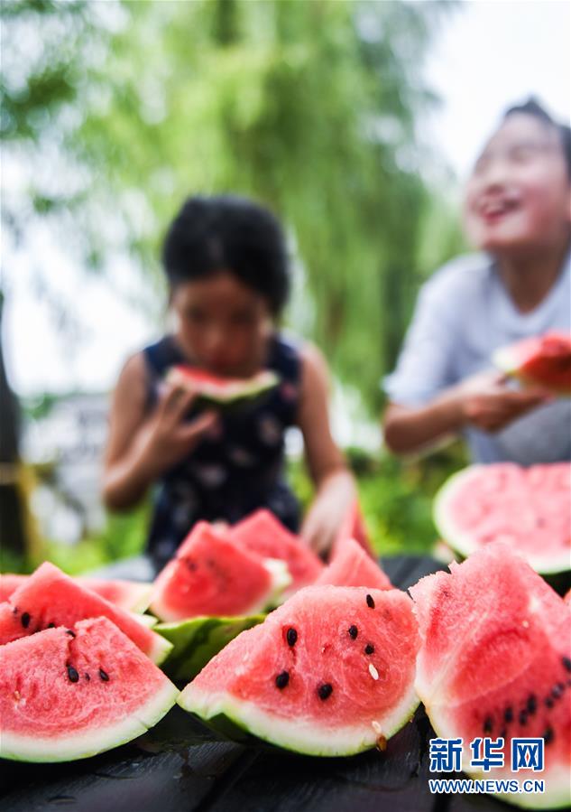 7月22日,廟兜村的孩子們?cè)诒荣惓晕鞴稀.?dāng)日是大暑節(jié)氣,浙江省湖州市吳興區(qū)織里鎮(zhèn)廟兜村舉行了趣味“賽西瓜”比賽,迎接這個(gè)“火熱”的節(jié)氣。廟兜村種植有500多畝西瓜,目前正值西瓜豐收的時(shí)節(jié),村民們用“賽西瓜”的形式,感受豐收的喜悅。新華社記者徐昱攝