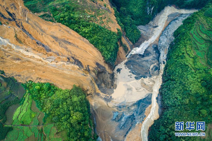 7月22日拍攝的因恩施州屯堡鄉(xiāng)馬者村山體滑坡形成的堰塞湖(無(wú)人機(jī)照片)。新華社記者肖藝九攝
