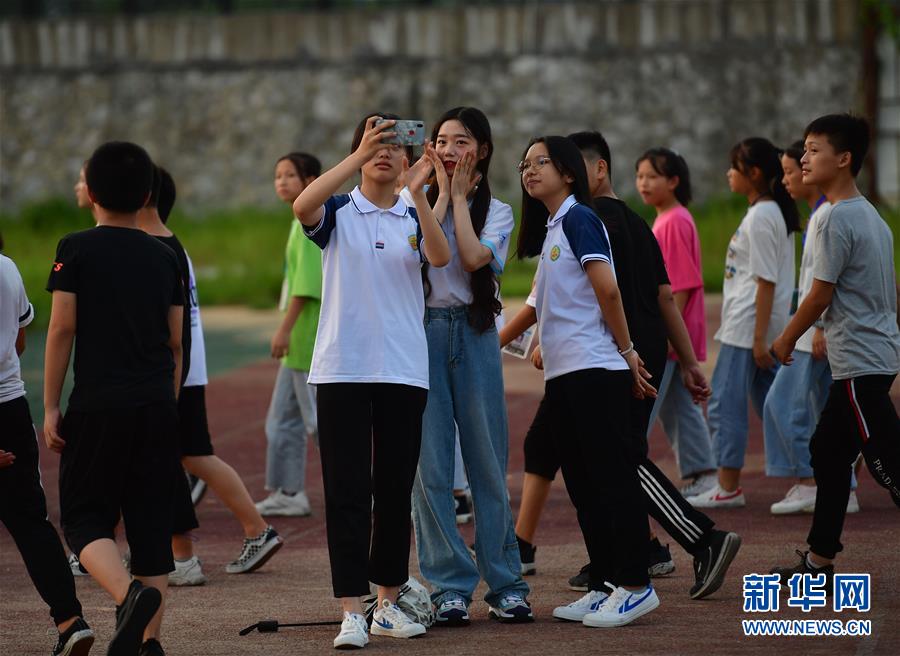 在融水苗族自治縣民族中學(xué)1818班舉辦的送別班會(huì)上,同學(xué)們與支教老師高潔(前右)道別(7月23日攝)。新華社記者黃孝邦攝
