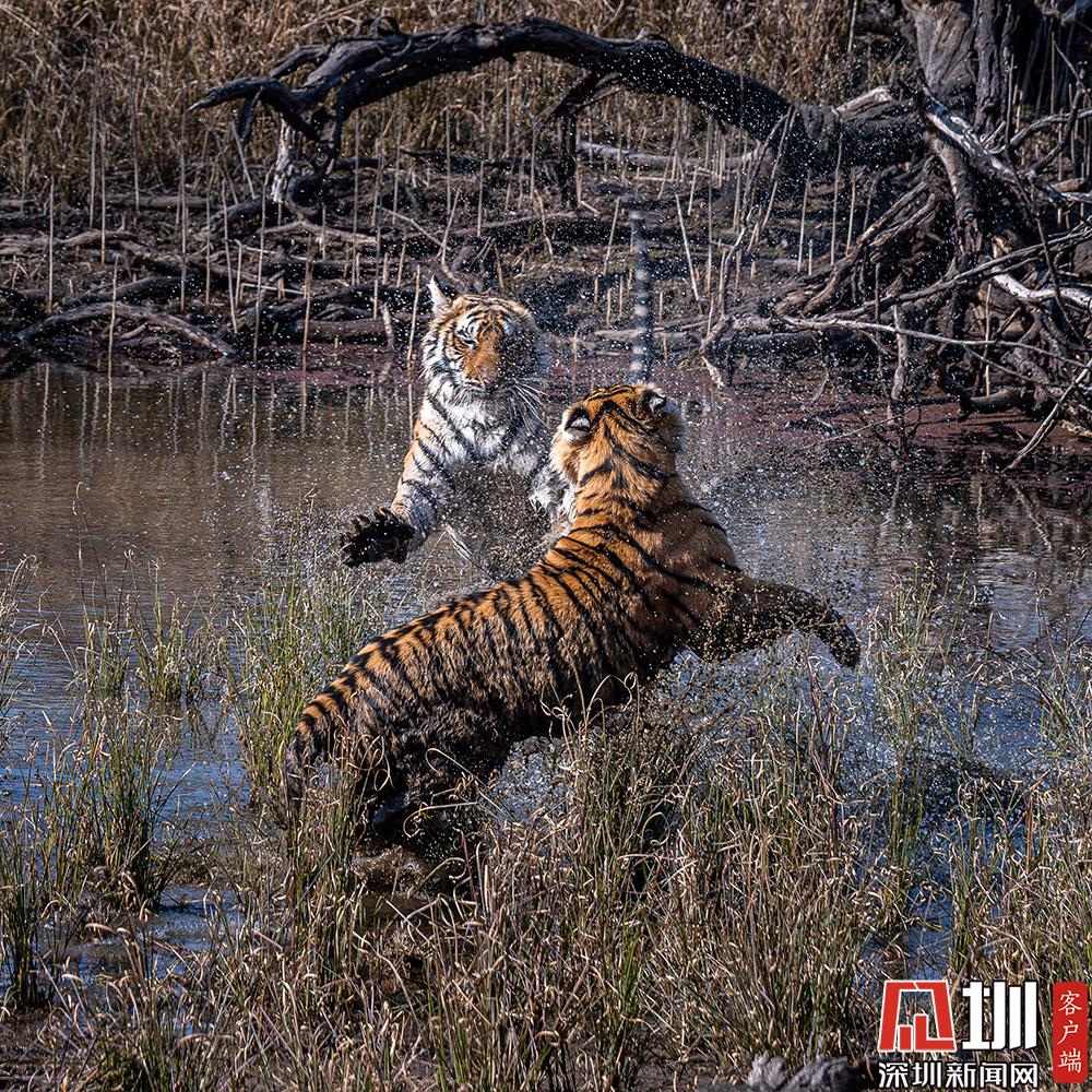2020年7月27日,兩只老虎幼崽激烈的水上爭奪戰(zhàn)。