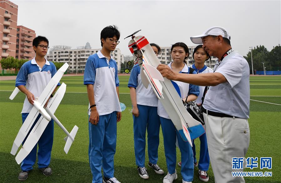7月27日,老師在天津中學(xué)操場(chǎng)上給參加暑期實(shí)踐營(yíng)的學(xué)生講解航模知識(shí)。新華社記者 李然 攝