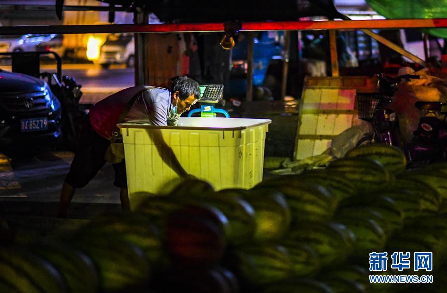 7月26日,在烏魯木齊新聯(lián)農(nóng)副產(chǎn)品綜合市場(chǎng)內(nèi),商販在挑選西瓜。新華社記者 趙戈 攝
