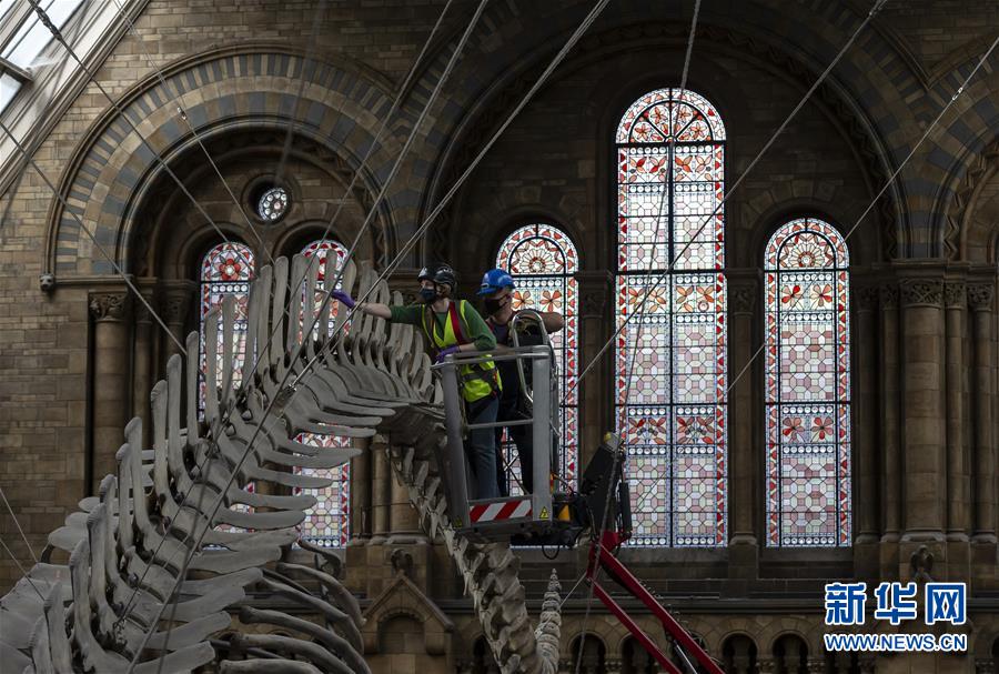 7月27日,工作人員在英國倫敦的自然歷史博物館大廳內(nèi)清潔一具藍鯨骨架。受新冠疫情影響關(guān)閉數(shù)月的英國自然歷史博物館將于8月5日重新對外開放,目前館方正在為重新開放做最后準備。參觀者需要提前預(yù)約參觀時段、全程佩戴口罩且保持安全距離。新華社記者韓巖攝
