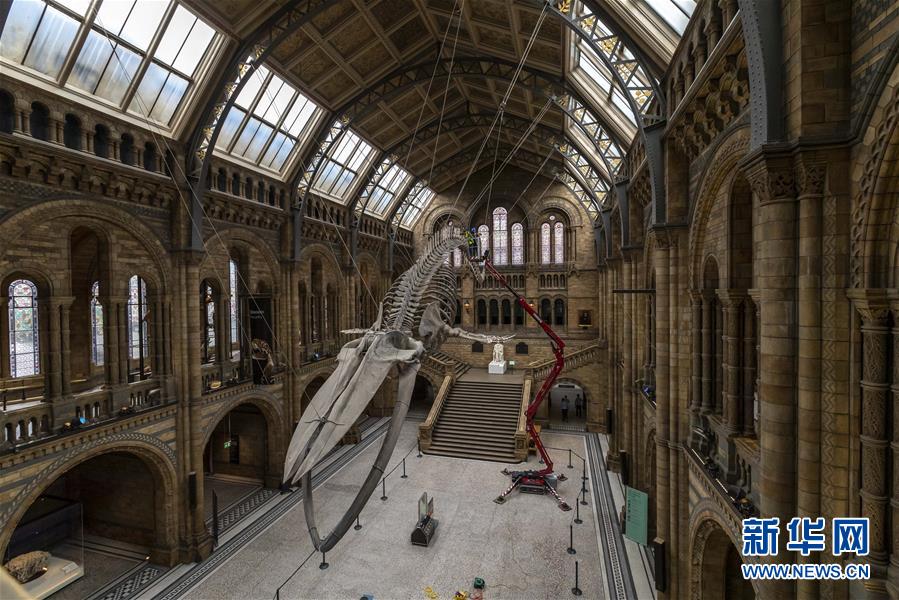 7月27日,工作人員在英國倫敦的自然歷史博物館大廳內(nèi)清潔一具藍(lán)鯨骨架。受新冠疫情影響關(guān)閉數(shù)月的英國自然歷史博物館將于8月5日重新對外開放,目前館方正在為重新開放做最后準(zhǔn)備。參觀者需要提前預(yù)約參觀時段、全程佩戴口罩且保持安全距離。新華社記者韓巖攝