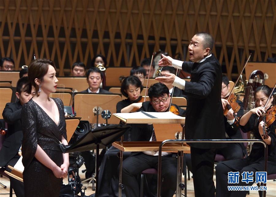 7月29日晚,作曲家譚盾(前右)在2020上海夏季音樂(lè)節(jié)閉幕音樂(lè)會(huì)上指揮。新華社記者任瓏攝
