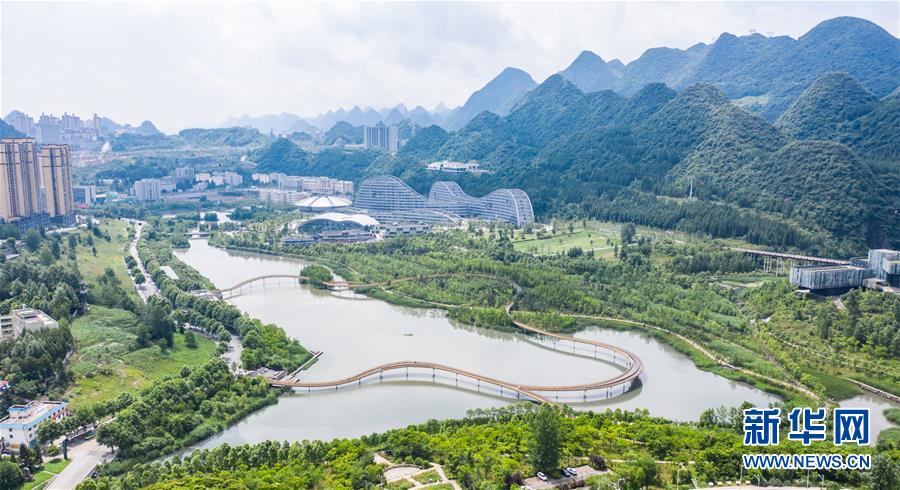 六盤水明湖國(guó)家濕地公園風(fēng)景(無(wú)人機(jī)照片,6月17日攝)。新華社記者陶亮攝