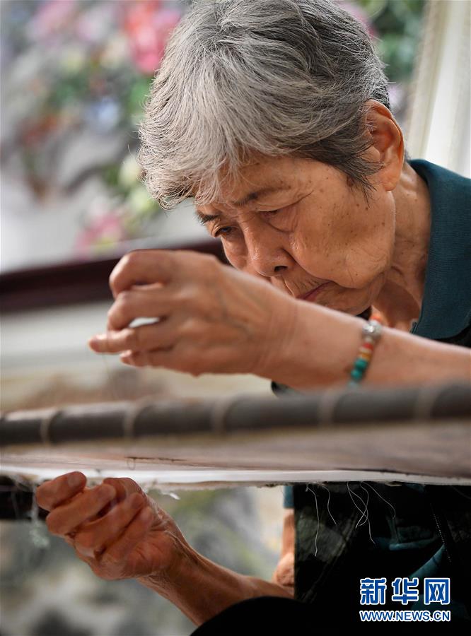 在開封市素花宋繡工藝有限公司的展示館里,王素花在刺繡(7月30日攝)。新華社記者李安攝