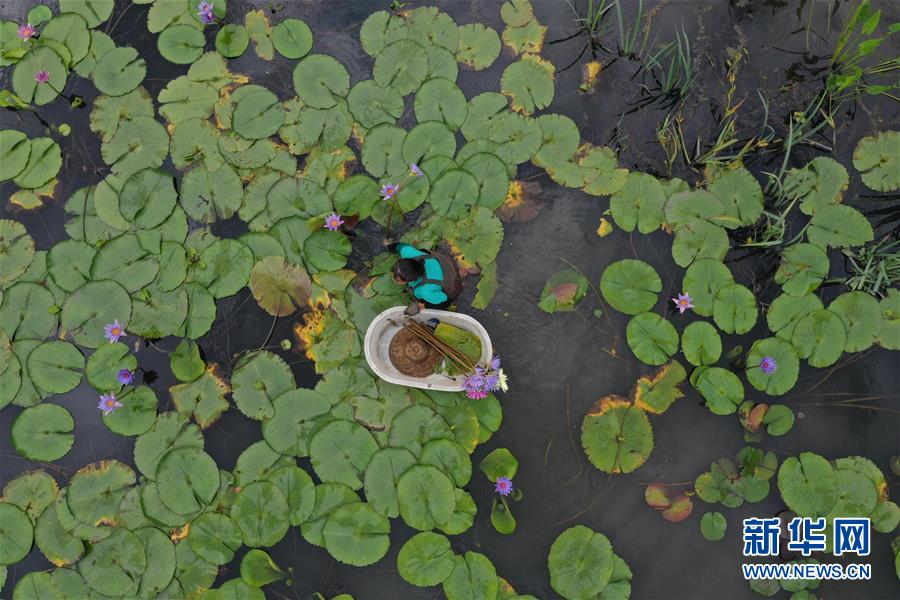 8月4日,藝溯家生態(tài)農(nóng)場(chǎng)工作人員在池塘采摘香水蓮花(無人機(jī)照片)。近年來,位于浙江湖州吳興區(qū)八里店鎮(zhèn)移沿山村的藝溯家生態(tài)農(nóng)場(chǎng),在約45畝的傳統(tǒng)水產(chǎn)養(yǎng)殖池塘上規(guī)?;N植香水蓮花,既凈化水質(zhì),又提高了經(jīng)濟(jì)效益。農(nóng)場(chǎng)還設(shè)計(jì)出種植、采摘和加工香水蓮花的工藝流程,以面向更多農(nóng)戶推廣。新華社記者黃宗治攝