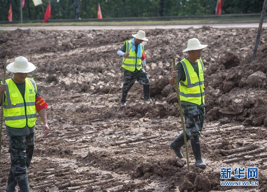 8月5日,夏德勤(左一)與同事在長江武金堤背水面巡查管涌情況。新華社記者肖藝九攝