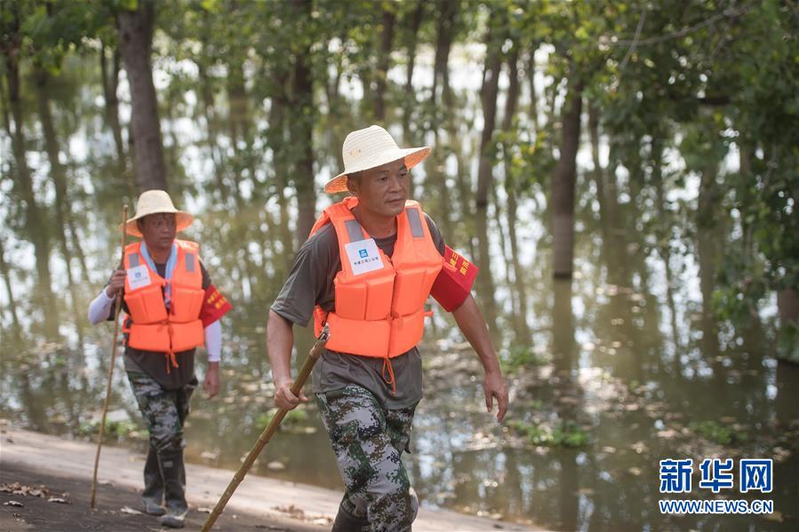 8月5日,夏德勤(右)與同事在長江武金堤迎水面巡查。新華社記者肖藝九攝