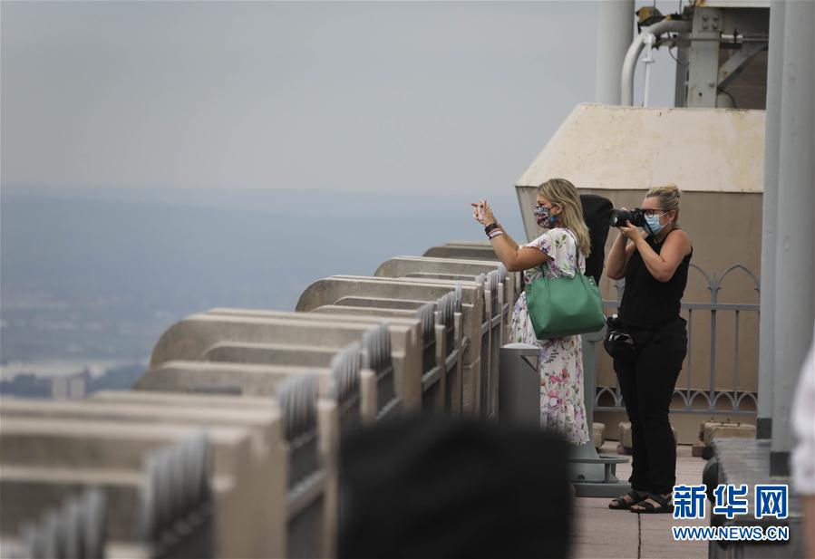 8月6日,在美國(guó)紐約,人們?cè)诼蹇朔评罩行挠^景臺(tái)上拍攝城市景觀。當(dāng)日,3月份暫時(shí)關(guān)閉的洛克菲勒中心觀景臺(tái)恢復(fù)對(duì)公眾開(kāi)放。每天13時(shí)至21時(shí),人們可戴口罩前往參觀。新華社記者王迎攝